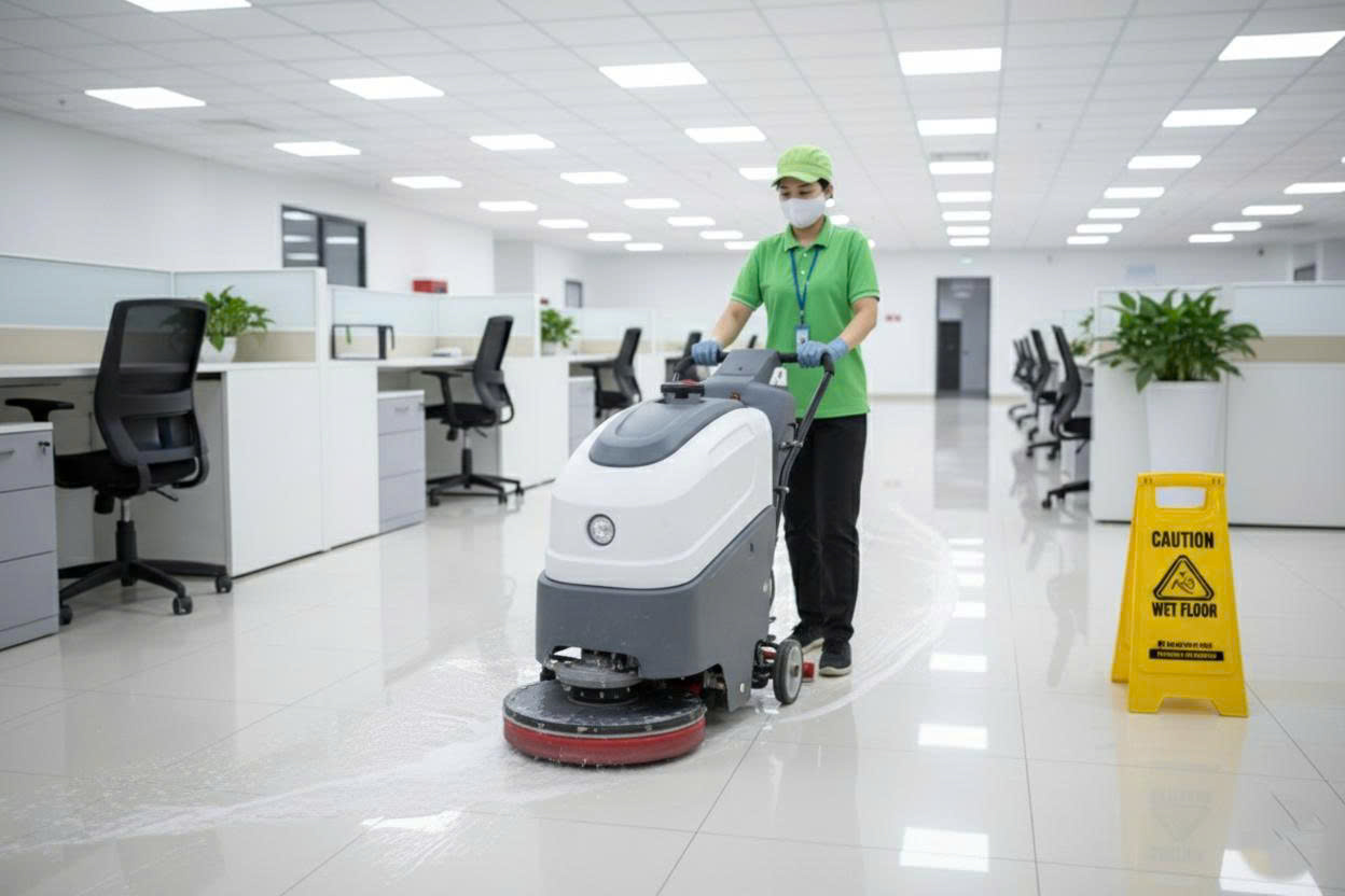 - Buổi sáng: nhân viên vệ sinh sẽ đến sớm hơn để làm sạch, chuẩn bị cho 1 ngày làm việc trước khi nhân viên của công ty đến làm việc. Nhiệm vụ chính buổi sáng: thu dọn rác của ngày hôm trước, lau dọn sạch sẽ bàn làm việc, hành lang đi lại chung, nhà vệ sinh chung thơm tho sạch sẽ